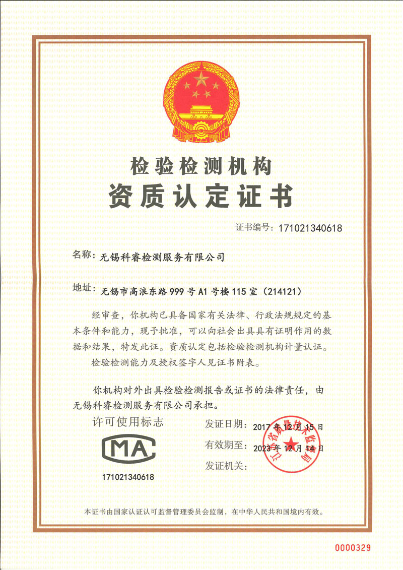 2010年取得CNAS證書,是無錫較早取得證書的民營第三方檢測公司,2014年獲得江蘇省民營科技企業的稱號,2017年獲得檢驗檢測機構資質認定證書(CMA)等多項榮譽資質。 科睿檢測始終追求先進科學的技術,過硬質量,貼心售后服務贏得了良好的市場口碑,客戶總數已達到1000 家以上,中國500強企業已超過100家。